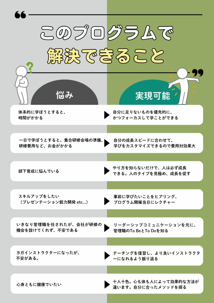 弊社の強みは、ヨガのエッセンスを取り入れながら、ビジネススキルアップも並行して行うプログラムです。ベースを整えるだけでなく、力強く前進していくための能力開発が特徴です。集合研修でもリピートされる企業様が多くいらっしゃいますが、会社が時間や教育費をかけたくてもかけられない状況もあるかと思います。もしくは、自分自身の成長を望んでいるがどうすれば良いかわからないなど、解決したいことは様々です。