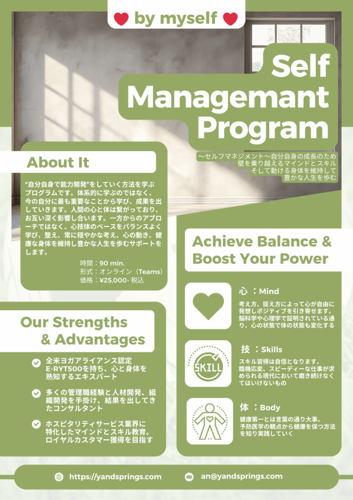 Y&Springs(ワイアンドスプリングス)がご提供するセルフマネジメントプログラム” by myself “は、ヨガをベースに心・技・体の3つのアプローチから身を委ねて時の流れに任せて自らを解き放ち、それぞれを安定したレベルで整えていきます。 人が幸せに生きていくこととは、心豊かに人生を紡ぐ大切な時を過ごしていくことだと確信しています。